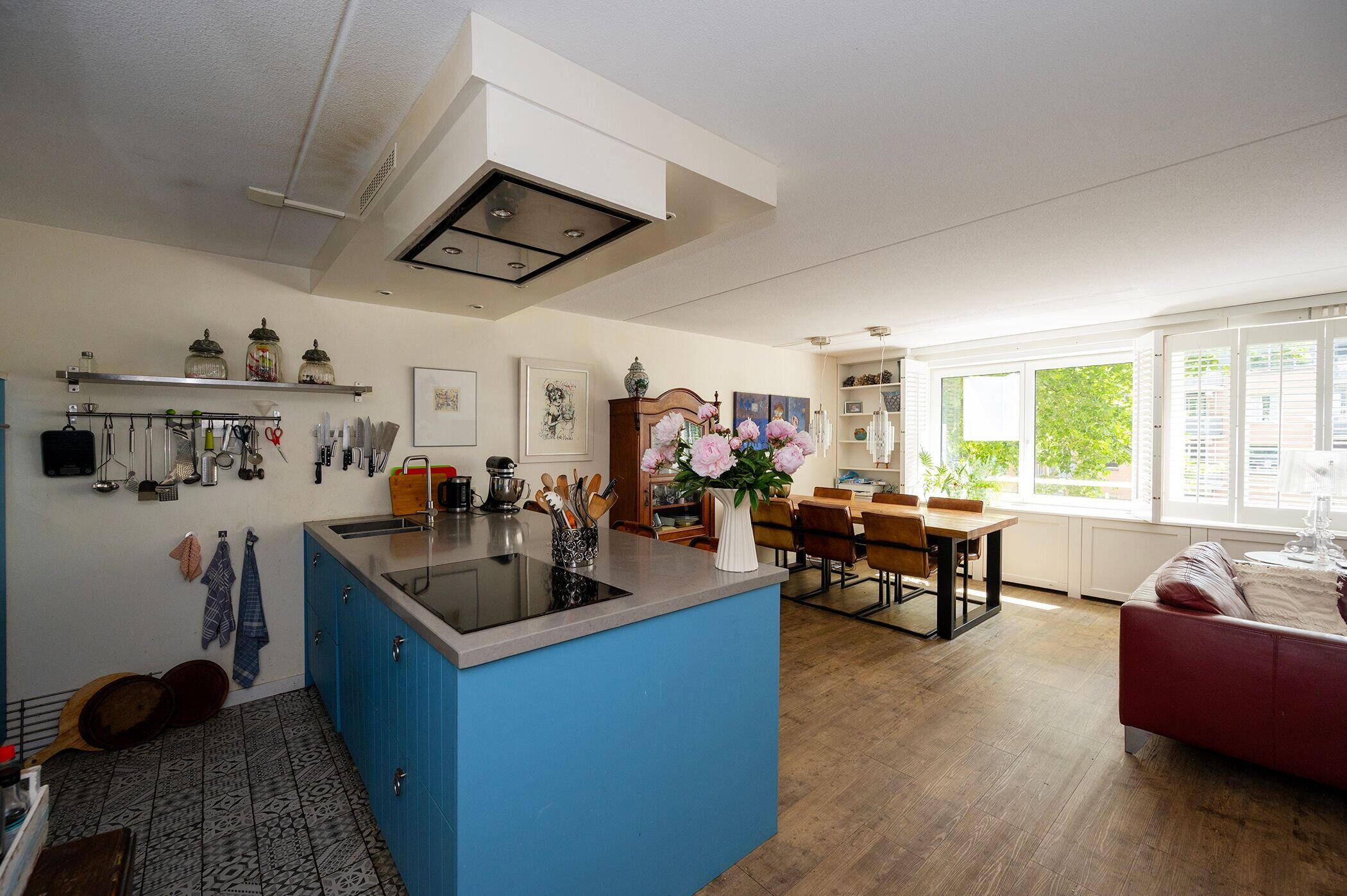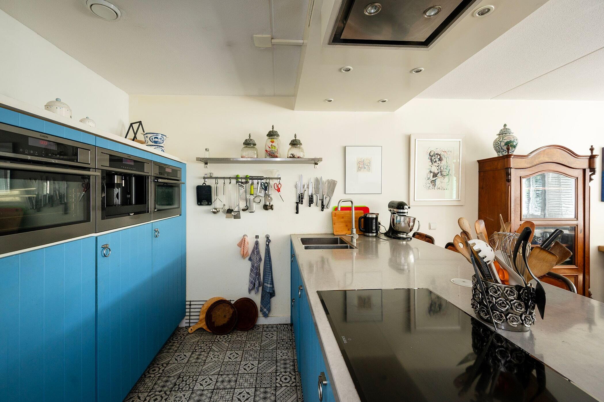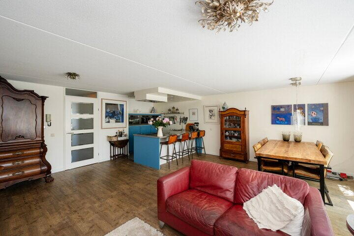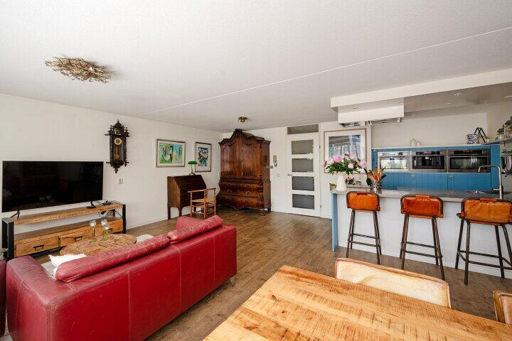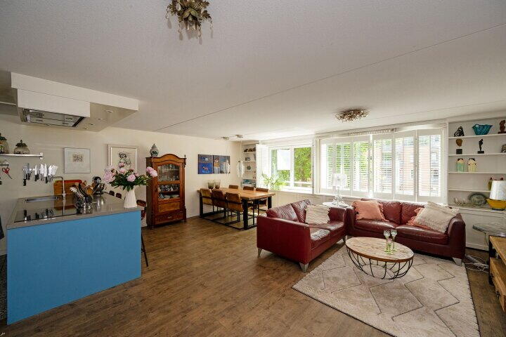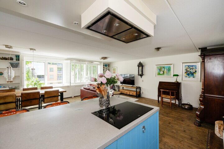 De open keuken sluit naadloos aan en is uitgerust met moderne inbouwapparatuur, een fijne plek voor kookliefhebbers die contact willen houden met hun gasten.