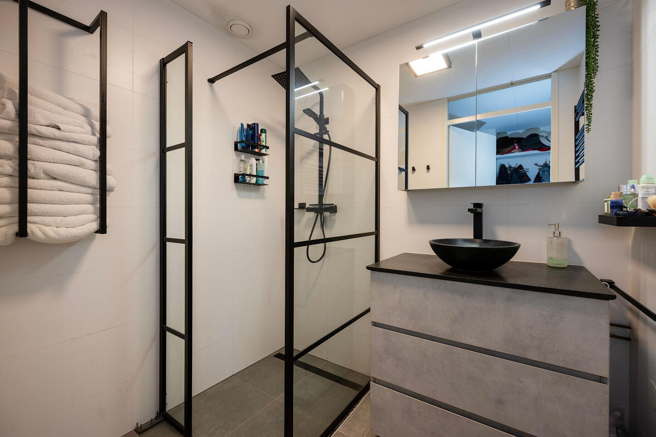 - Douche, inloopdouche, wastafel, en wastafelmeubel