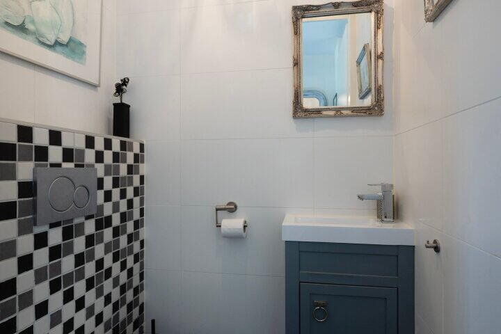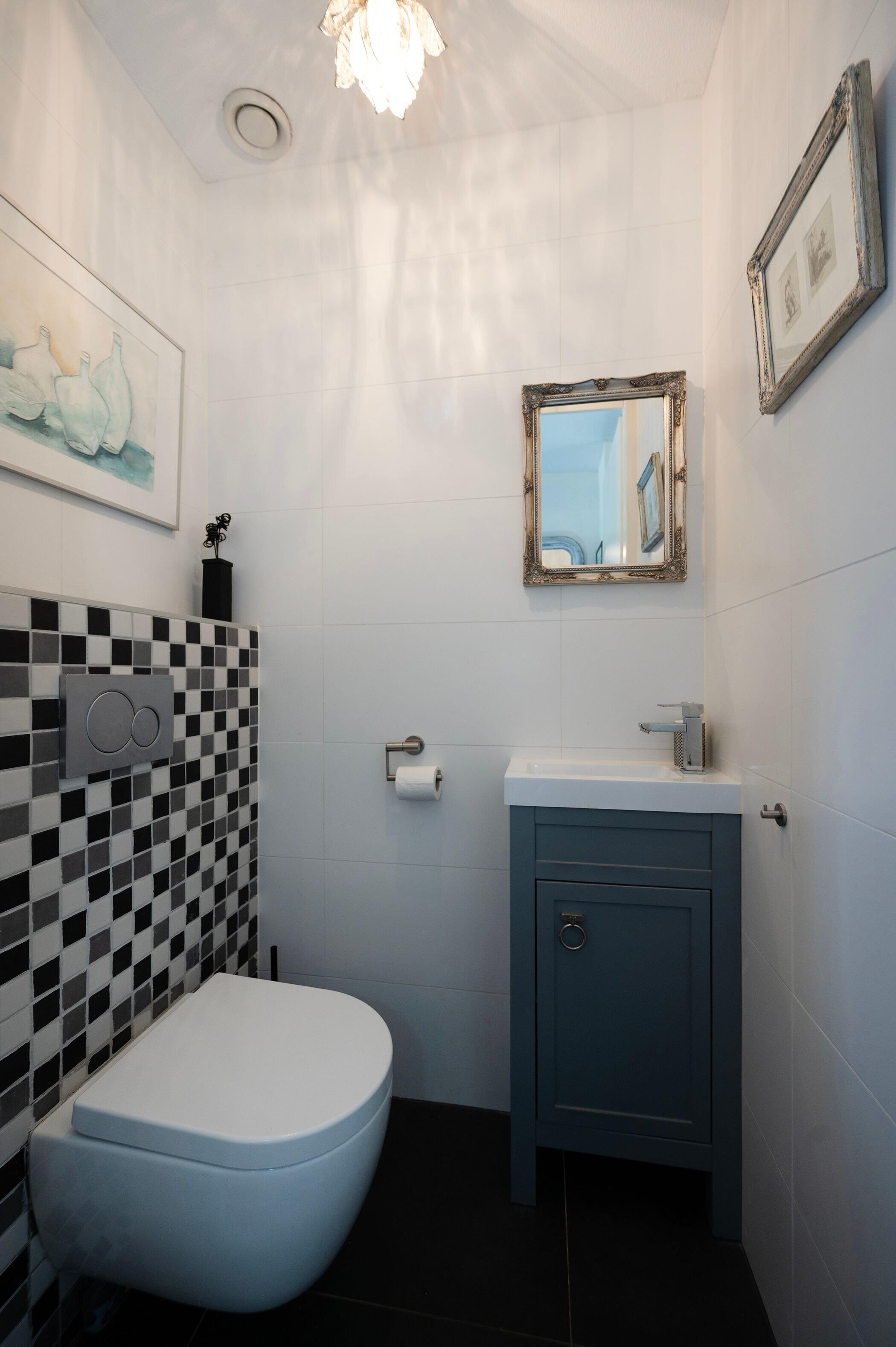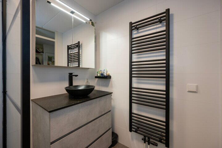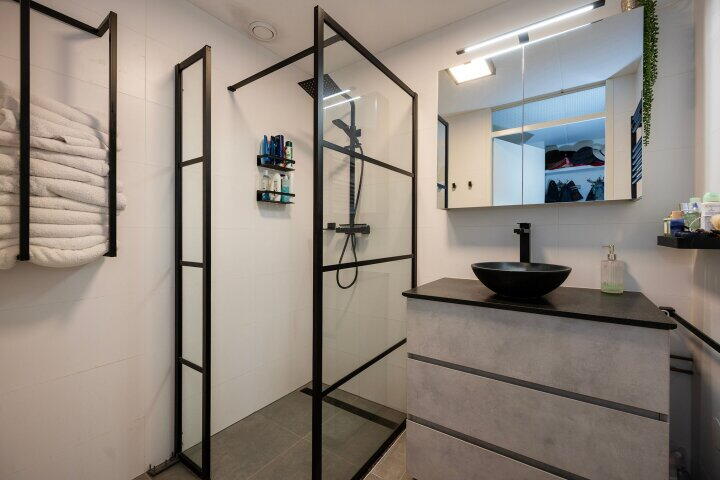 De moderne badkamer is keurig afgewerkt met een inloopdouche en wastafelmeubel. Het separate toilet is netjes en in moderne stijl uitgevoerd.